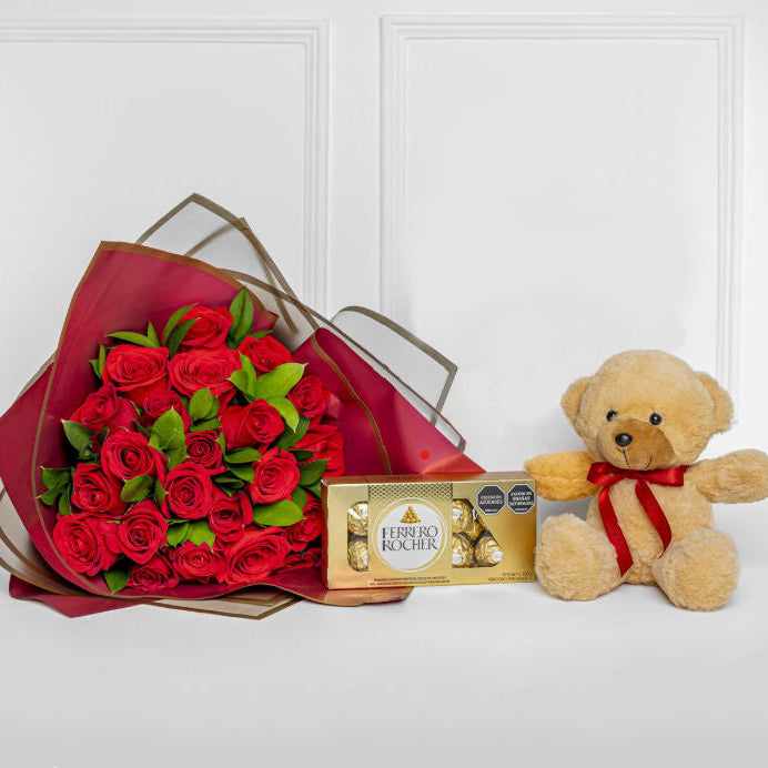 Surprise your loved one in Bogotá or Medellín with the perfect romantic gift. This exclusive set includes a stunning bouquet of 24 fresh red roses, a box of Ferrero Rocher chocolates, and an adorable teddy bear with red ribbon. Carefully arranged to express love, passion, and affection, it’s the ideal choice for Valentine’s Day, Love and Friendship Day, birthdays, anniversaries, or any romantic occasion.