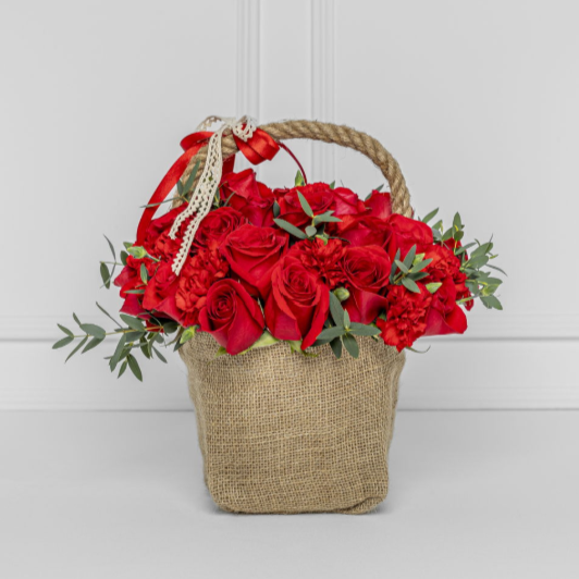 Bring elegance and timeless beauty to any occasion with this natural fiber basket filled with lush red roses and seasonal greenery. Designed in a classic and sophisticated style, this arrangement is ideal for expressing love, admiration, and heartfelt emotions.